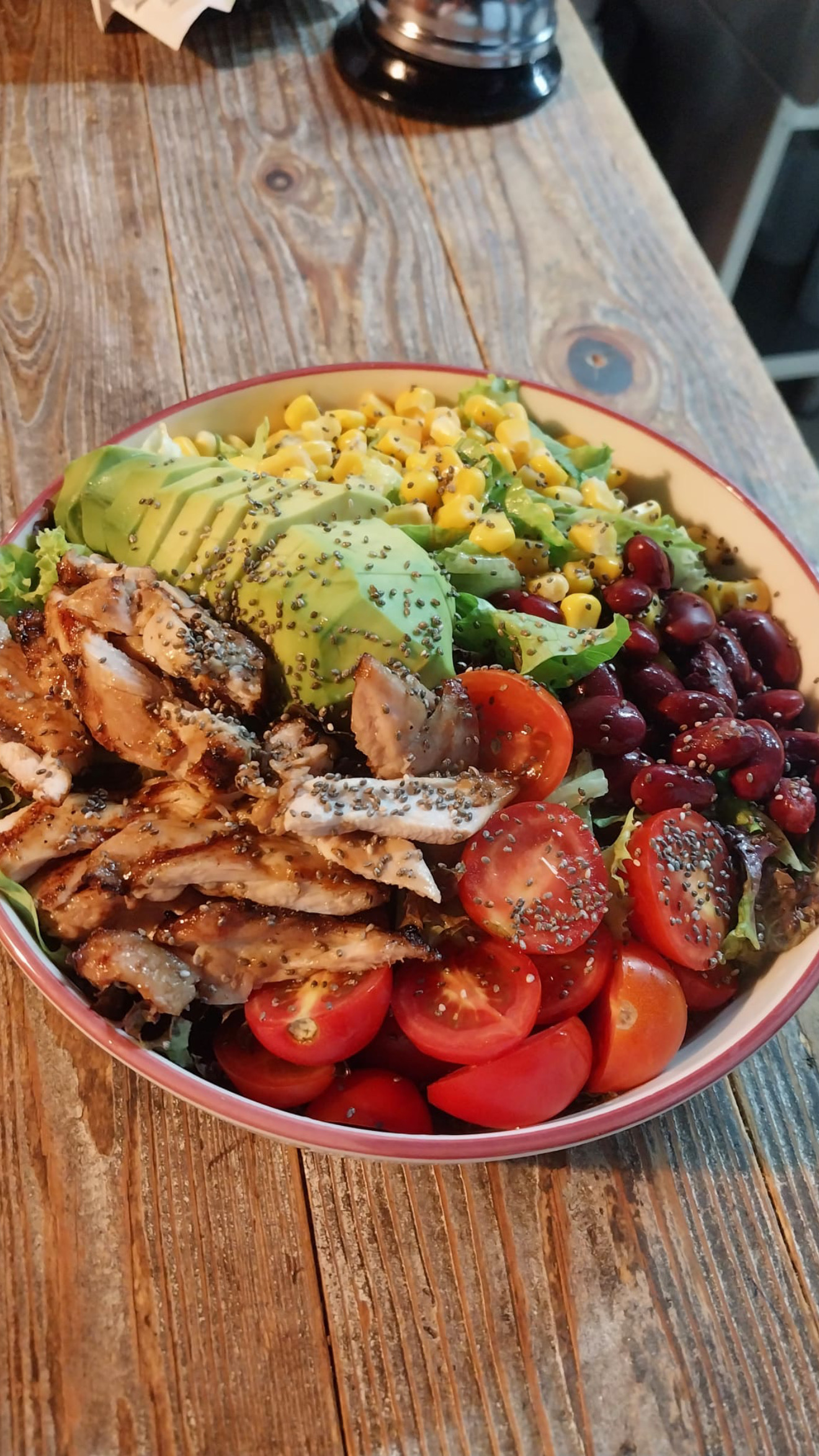 Mısır, jalepeno biber, Meksika fasulyeli domates sos üzerine mozzarella peyniri, Akdeniz yeşillikleri ve kumpir patates ile servis edilir.